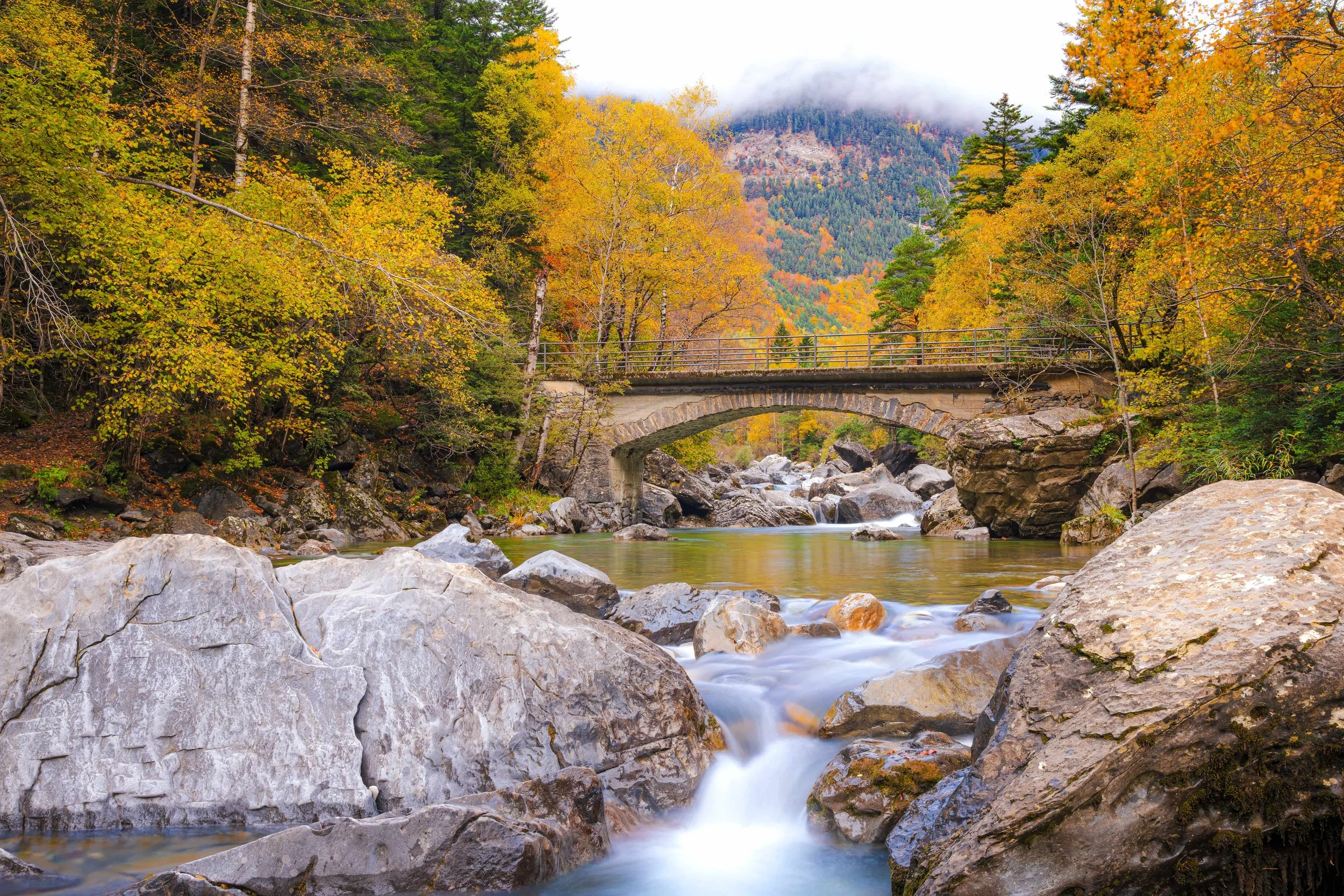Para despedirnos del otoño en el Pirineo, decidimos visitar la zona del Cañón de Añisclo. Tras una ruta en coche por carreteras sinuosas que dejaban ver inmensos bosques manchados por el naranja y el amarillo de esta estación, llegamos al parking de Tella. Desde ahí empezamos nuestra ruta.